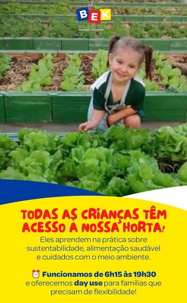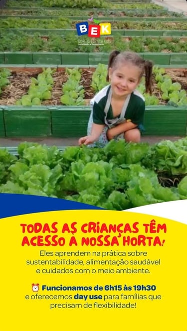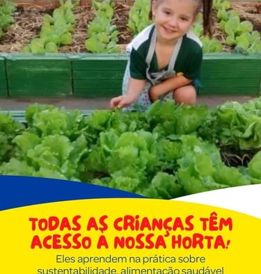 Nosso espaço inclui playground ao ar livre, acesso à horta e práticas de sustentabilidade, sempre focando na socialização e no desenvolvimento personalizado de crianças de 1 mês a 10 anos.